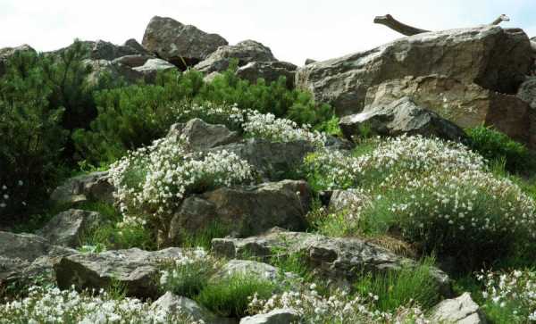 Уход за такими цветниками из камней, расположенных на уровне земли, заключается в поливах, уничтожении сорняков, удалении отцветших растений, а также в подкормках.