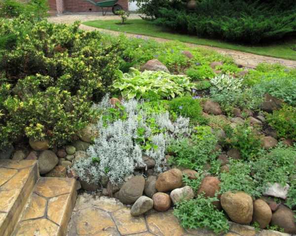 Существует несколько вариантов ландшафтного дизайна из камней, при котором используется сочетание природного каменного материала и различных растений. Это могут быть рокарии, альпинарии, клумбы из камней, а также подпорные стенки и террасы.
