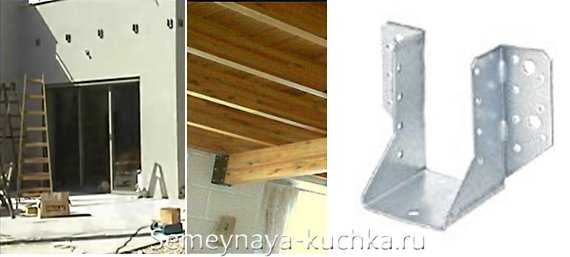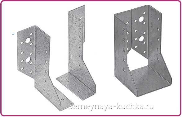 Здесь несущие боковые балки — крепятся к стене при помощи МЕТАЛЛИЧЕСКИХ КРЕПЕЖЕЙ (фото ниже показывает, какие они бывают). К стене дома крепятся такие металлические скобы и в них вкладываются концы двух боковых балок нашего навеса.