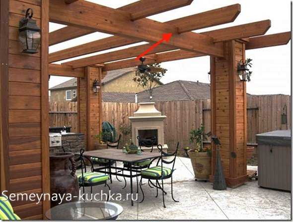 А опорные вертикальные столбы с другого конца перголы (т.е. которые с наружного конца крыльца) – имеют диагональные коротенькие брусья-подпорки, которые держат вторую несущую горизонтальную балку (стрелочка 2).