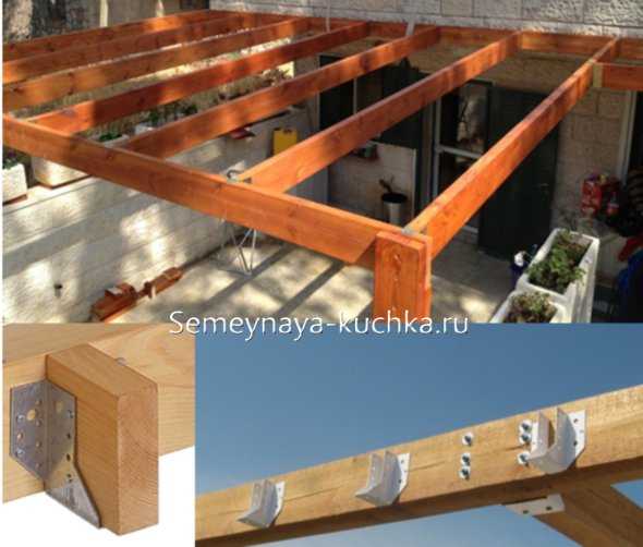 На стену (каменную или деревянную или кирпичную) крепим скобы-держатели… Вот как мы видим на фото ниже… И на них кладем наши боковые поперечные балки (как на модели №1 навеса из этой статьи).