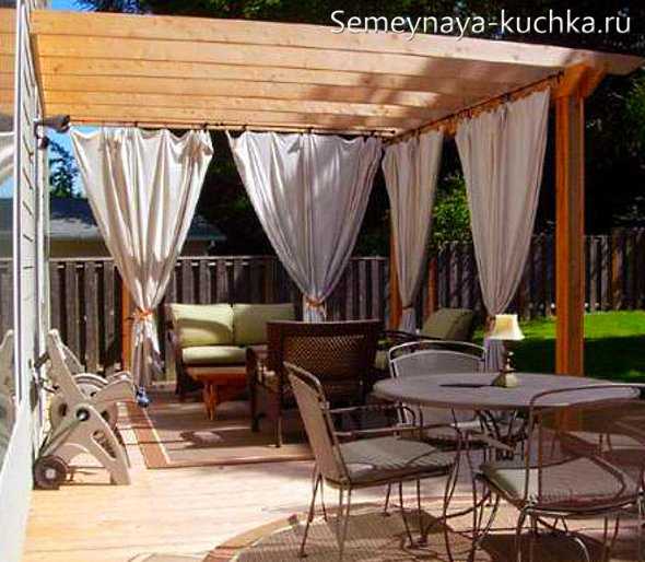 Крышей в таком пристроенном к дому навесе может быть лист поликарбоната (прозрачного или затемненного)… или крышей может служить тент-шторка, который скользит по натянутой металлической струне (и то раздвигается как шатер, то собирается к стене как шторки). Подробнее о такой крыше-шторке для навесов я рассказала в статье Как сделать крышу для навеса и перголы.