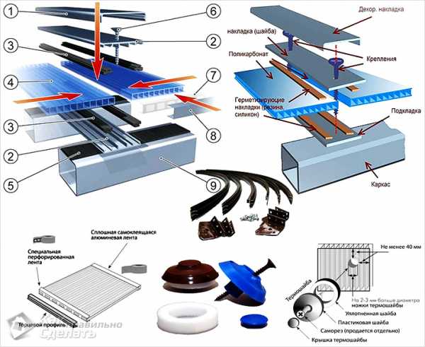 9. После установки каркаса, начинайте кровельные работы. Поликарбонат крепится к профилю с помощью пресс – шайб, профилированные листы – также, но с небольшим нахлестом в 4-5 сантиметров.