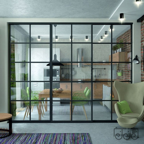 Алюминиевая раздвижная межкомнатная перегородка Слим. Модель «Решетка». Профиль черного цвета. RAL 9005. Заполнение — прозрачное стекло.
