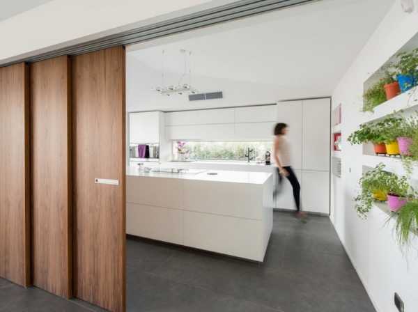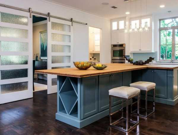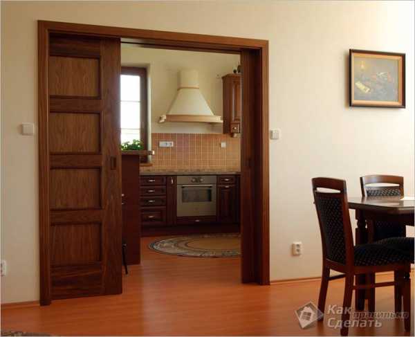 Если простенок демонтирован не полностью, а только расширен проем, то перегородку изготавливают с двумя створками, которые скользят по одной направляющей навстречу друг другу. Это будет двустворчатая раздвижная дверь. В этом случае перед установкой дверей следует убедиться, что по бокам проема имеется пространство для сдвигания створок вдоль стены. Раздвижные панели будут отличаться от стандартных створок высотой. Направляющая должна быть в четыре раза длиннее ширины одной панели.