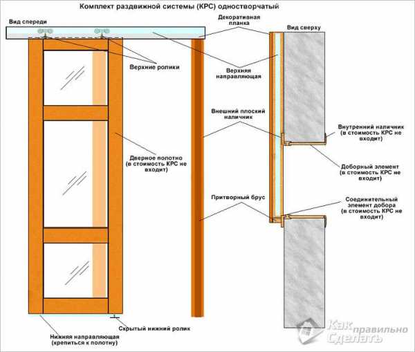Декоративные планки для маскировки направляющих приобретаются отдельно. Дверной коробки в традиционном понимании в конструкции раздвижной перегородки нет. Для отделки проема вместо коробки можно поклеить доборные рейки. В широких проемах с притолокой как минимум одну сторону коробки отделывают наличником.