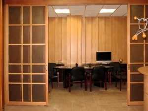 Рифлёное матовое стекло используют для раздвижных перегородок в офисах
