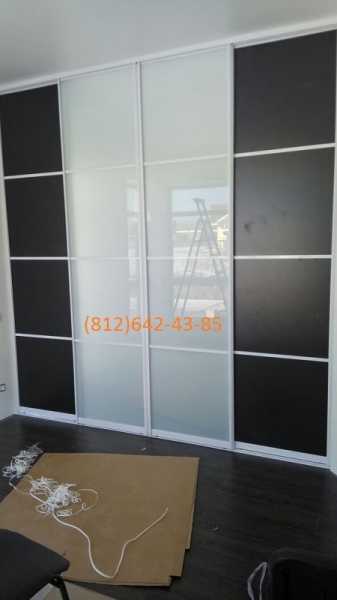 По наполнению дверей-купе также есть нюансы: т.к. раздвижные двери-купе изначально предназначены для шкафов-купе, гардеробных и ниш, то обратная сторона у них не облагорожена. К материалам, которые есть в нашем арсенале и имеют одинаковую лицевую и оборотную сторону относятся: МДФ. матовое стекло (стекло с плёнкой). и стекло сатин или сатинат. На фото ниже сочетание этих двух материалов: