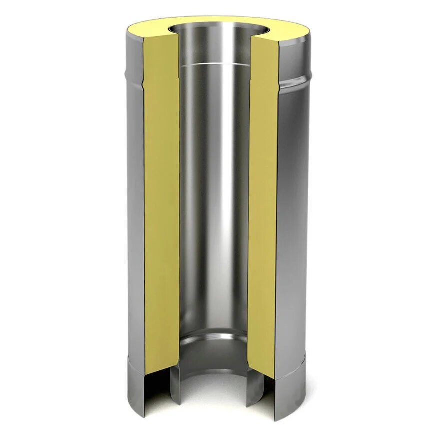 Двустенные дымоходы — термоизолированные трубы, которые состоят из внутренней и внешней трубы (кожуха). Внутри размещен слой негорючего изоляционного материала. Внутренняя труба изготовлена из нержавеющей стали. Утеплитель — толщиной 30-50 мм — прессуемый ми.