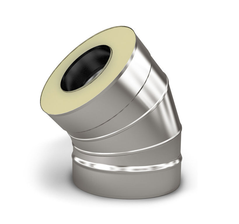 Элементы двустенных дымоходов Двустенные дымоходы — термоизолированные трубы, которые состоят из внутренней и внешней трубы (кожуха). Внутри размещен слой негорючего изоляционного материала. Внутренняя труба изготовлена из нержавеющей стали. Утеплитель — толщиной 30-50 мм — прессуемый ми..