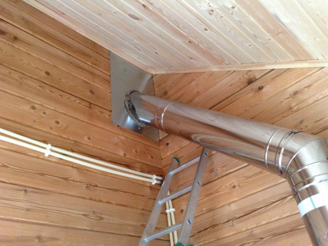 Чтобы не показывать огонь, нужно проложить дымоход так, чтобы он не касался стены или перекрытия потолка. Сэндвич-трубы должны находиться в специальных коробах, ограничивающих их соприкосновение с другими материалами.Для большей безопасности ящик оснащен базальтовой ватой. Довольно часто дымоход монтируют самостоятельно, отделяя от потолка металлическим листом небольшого размера.