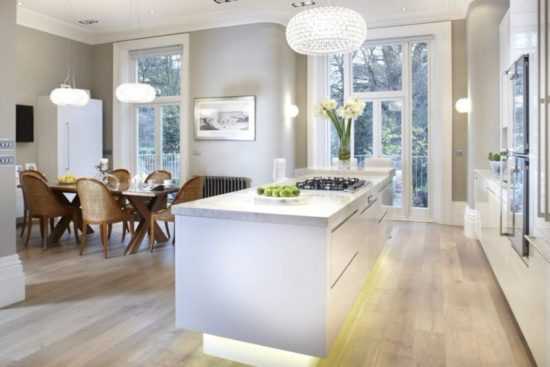 Для серой кухни вариантов освещения может быть довольно много: