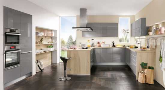- Серый цвет кухни в сочетании цветов с нейтральными оттенками, такими как светлый коричневый, белый или черный.