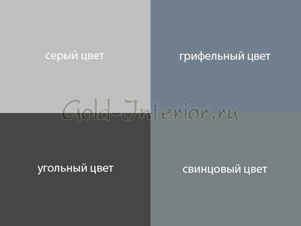 Серые оттенки: пепельный, известковый, свинцовый, сизый, серебристый, жемчужный, дымчатый, угольный, цвет асфальта, грифеля, дождливых облаков, бетона, стали, металла, морской пены, мрамора, тумана, алюминия, шкуры слона, морёного дуба, гранита, чёрное дерево.