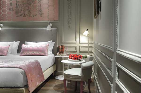 Жизнерадостный оттенок весенних цветов на сером фоне как будто светится изнутри, делая обстановку романтической и немного легкомысленной. Розовые элементы интерьера наверняка понравятся девушкам с мягким женственным характером. Также это хороший вариант для оформления детской комнаты маленькой принцессы.