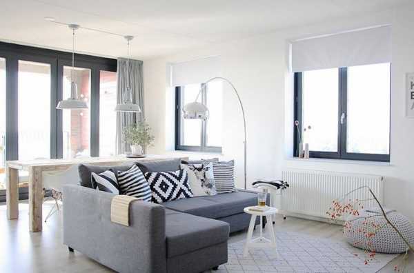 В североевропейском дизайне применяются обычно самые светлые оттенки серого, причем они обязательно разбавляются чистым белым, деталями из беленого дерева, вкраплениями народного декора (пэчворк, тканые коврики, текстиль крупной вязки). Такое оформление подойдет для маленьких и средних помещений, создавая в них спокойный уют с нотками домашнего тепла.