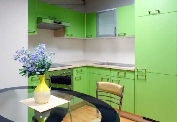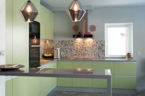 Зеленый вместе с цветом серого гранита и кухонной техники стального цвета выглядят модно и красиво