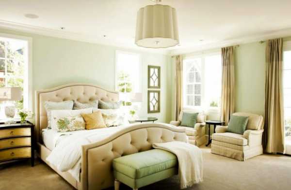 Пастельно-зеленый в сочетании с молочным цветом подойдут для спальни