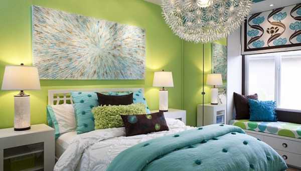 Зелено-фиолетовое сочетание хорошо подходит и для спальни