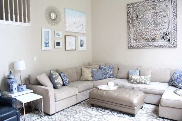 Темные оттенки серого в сочетании с бежевым, можно разбавить нейтральными цветам, белым, черным или коричневым. Прибавить комнате света можно с помощью светлых занавесок и больших окон. Также в серо-бежевую комнату можно добавить ярких акцентов, например персиковые подушки, ковер с желтым узором, большие цветы в горшках.