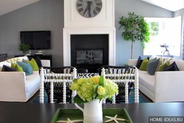 Бело-зеленое сочетание хорошо подходит и для гостинной