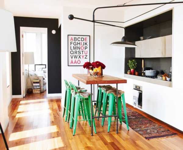 Оранжевые стулья в компании с оранжевыми светильниками и зеленым столом добавляют сочности и нескучности обычной кухне