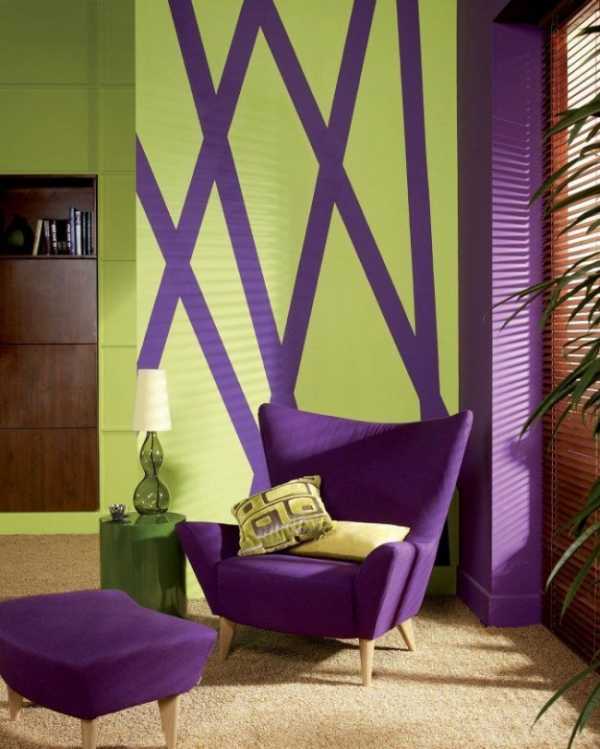 Фиолетовые полосы на зеленых стенах дополняет фиолетовая мебель