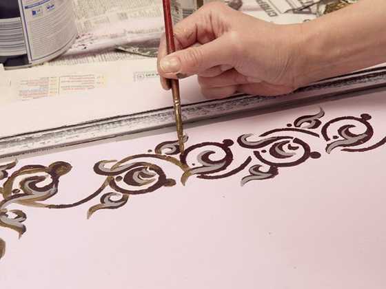 Качество росписи мебели с помощью трафарета зависит оттого, насколько тщательно подготовлена поверхность и продумано решение декора. Отделочное лаковое покрытие улучшит вид росписи и защитит поверхность, если это необходимо, от истирания.