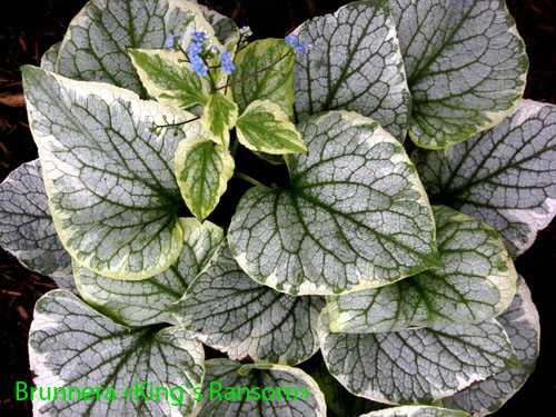 БРУНЕРА КИНГ РЕНСОМ Brunnera macrophylla “ King`s Ransom” 30. Листья боль-шие, декоративные, серебристые с темно-зелеными прожилками и широкой кремовой каймой. Это конечно впечатляет. Цветы голубые. Полутень. |