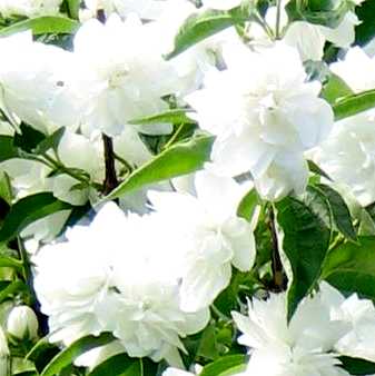 ЧУБУШНИК «Жемчуг» (Вехов 1962г.) Куст небольшого размера до 1 м высотой. Побеги изогнутые с красноватой корой. Цветки с перламутровым блеском, чисто белые, махровые до 6 см в диаметре, с лёгким ароматом ванили. Цветение обильное со второй декады июня 18 дней. Является бриллиантом среди сортов веховских жасминов. |