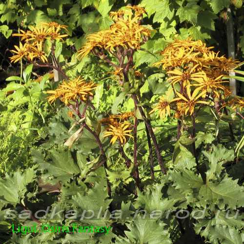 БУЗУЛЬНИК ОСИРИС ФЕНТЕЗИ Ligularia hybride “Osiris Fantasy” 50. Листья плотные, рифленые, вееровидные, волнистые и глубоко зубчатые по краю, темно-зеленые, с изнанки и по жилкам пурпурные. Цв. золотисто-желтые на пурпурно-красных цветоносах. Тене и влаголюбив. |