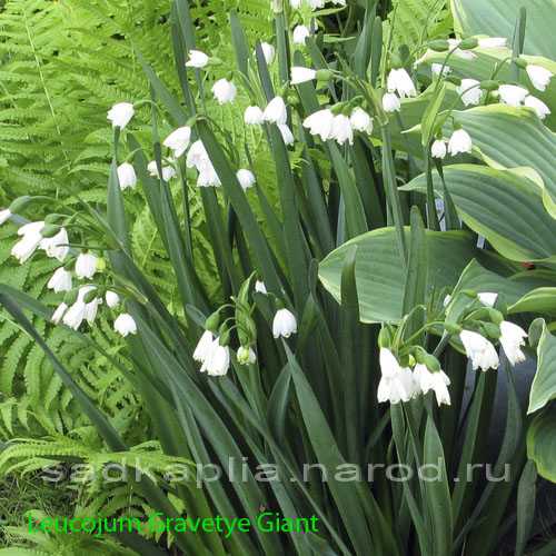 БЕЛОЦВЕТНИК ГРЭЙВИТИ ДЖАЙНТ Leucojum aestivum “Gravetye Giant” 60. Л. ремневидные сизо-зеленые, цветки белые по 3-6шт. собраны в зонтиковидное, поникающее соцветие. На кончиках цветочных сегментов по одному зеленому пятну. Цветет с конца мая около месяца. Сорт выведен в Англии. Влаголюбив. Солнце, полутень. |