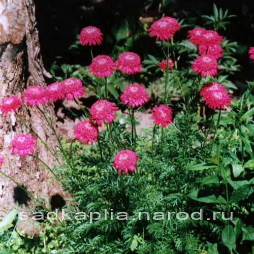 ПЕРЕТРУМ МАЛИНОВЫЙ 60/8. Цв. крупные полностью махровые, помпоновидные, ярко малиновые. Л. мелкоразрезные, ажурные, темно зеленые. Цветет с июня. Срезка. Солнце, легкая тень. |