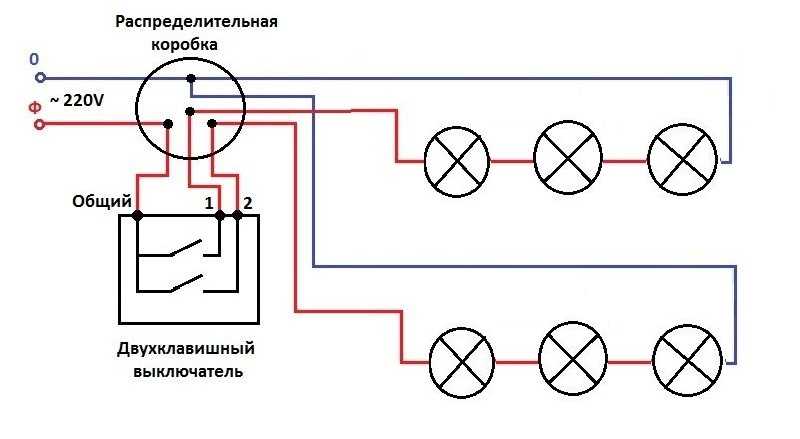 Фазный конец (красный) идет на одну из клемм. Оттуда перемычка на выключатель. С его выходящих контактов идут два провода (на рисунке – желтый и бежевый) в распределительную коробку, а оттуда – на соответствующие лампы. Если необходимо изменить порядок включения клавиш, поменяйте желтый и бежевый концы на клеммах местами.