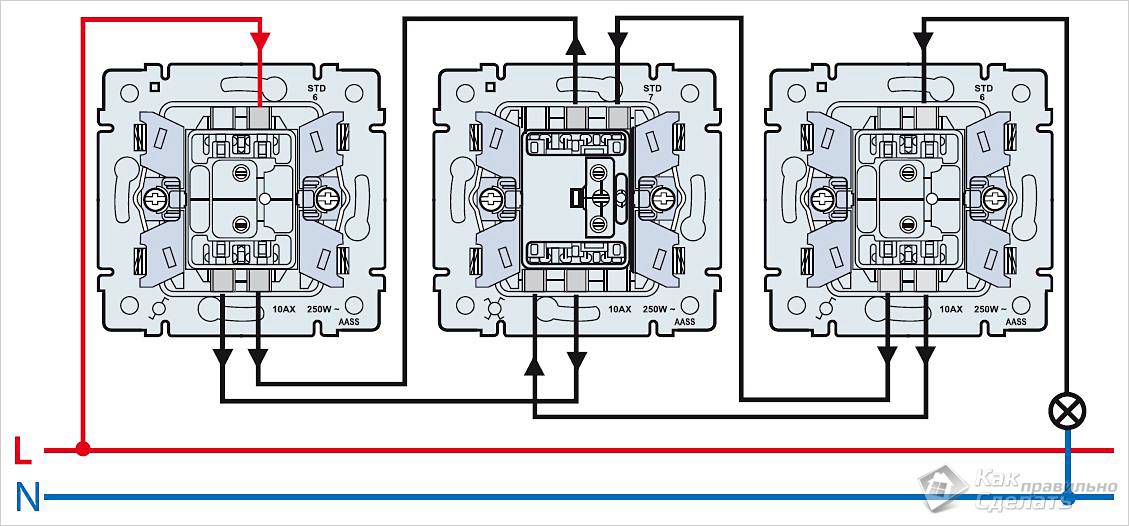 ΠΡΠ°Π²ΠΈΠ»ΡΠ½Π°Ρ ΡΡΡΠ°Π½ΠΎΠ²ΠΊΠ° ΠΏΡΠΎΡ ΠΎΠ΄Π½ΠΎΠ³ΠΎ ΡΡΡΡΠΎΠΉΡΡΠ²Π° ΠΏΠΎΠ·Π²ΠΎΠ»ΠΈΡ Π΅ΠΌΡ ΡΡΠ½ΠΊΡΠΈΠΎΠ½ΠΈΡΠΎΠ²Π°ΡΡ ΠΏΠΎ Π΄Π²ΡΠΌ Π½Π°ΠΏΡΠ°Π²Π»Π΅Π½ΠΈΡΠΌ. ΠΠ²Π° Π²ΡΠΊΠ»ΡΡΠ°ΡΠ΅Π»Ρ ΡΠ»Π΅Π΄ΡΠ΅Ρ Π·Π°ΠΊΡΠ΅ΠΏΠΈΡΡ Π² ΠΏΠΎΠ΄ΡΠΎΠ·Π΅ΡΠ½ΠΈΠΊΠ°Ρ , ΠΏΠΎΡΠ»Π΅ β ΠΊ ΠΏΡΠΎΠ²ΠΎΠ΄ΠΊΠ΅, Π²Π΅Π΄ΡΡΠ΅ΠΉ ΠΊ ΠΎΡΠ²Π΅ΡΠΈΡΠ΅Π»ΡΠ½ΡΠΌ ΠΏΡΠΈΠ±ΠΎΡΠ°ΠΌ, ΠΏΠΎΠ΄ΡΠΎΠ΅Π΄ΠΈΠ½ΠΈΡΡ ΡΡΠ΅Ρ ΠΆΠΈΠ»ΡΠ½ΡΠΉ ΠΊΠ°Π±Π΅Π»Ρ. ΠΠ°ΠΆΠ΄ΡΠΉ ΠΏΡΠΎΡ ΠΎΠ΄Π½ΠΎΠΉ ΠΏΠ΅ΡΠ΅ΠΊΠ»ΡΡΠ°ΡΠ΅Π»Ρ ΡΠΎΠ΄Π΅ΡΠΆΠΈΡ 3 ΠΊΠΎΠ½ΡΠ°ΠΊΡΠ°, ΠΏΠΎΡΡΠΎΠΌΡ ΠΊΠ°Π±Π΅Π»Π΅ΠΉ Π½Π΅ΠΎΠ±Ρ ΠΎΠ΄ΠΈΠΌΠΎ 2.
