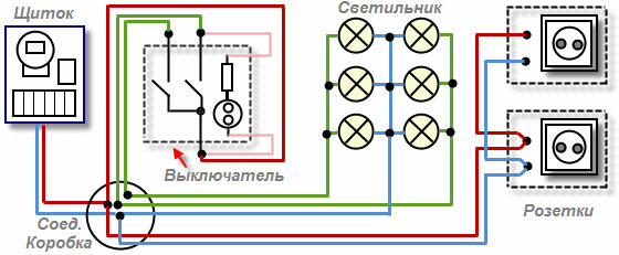 - 2 Схема подключения одного источника света с одноклавишным выключателем