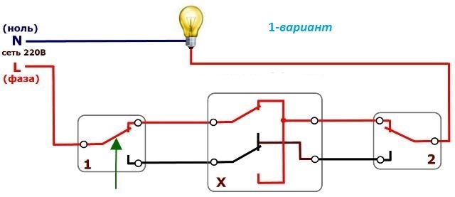 Построение схожих схем, обычно, осуществляется с ролью так именуемого перекрёстного переключателя. Два провода к ней подходят из распределительной коробки либо из розетки.
