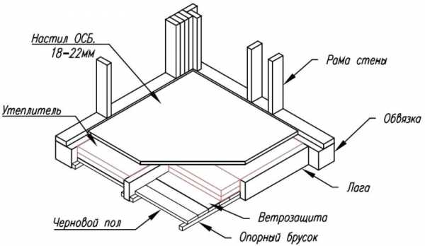 Следующим шагом после установки опор является нижняя обвязка вертикальных стоек. Для этого используют брус с сечением 50х150 мм. Каркас пола выполняется посредством монтажа лаг, которые располагают на расстоянии не более 45 см друг от друга. Это позволит конструкции каркаса выдержать вес деревянного помоста. Лаги крепятся к брусьям горизонтальной обвязки с помощью креплений-уголков, предварительно просверлив монтажные отверстия для саморезов.