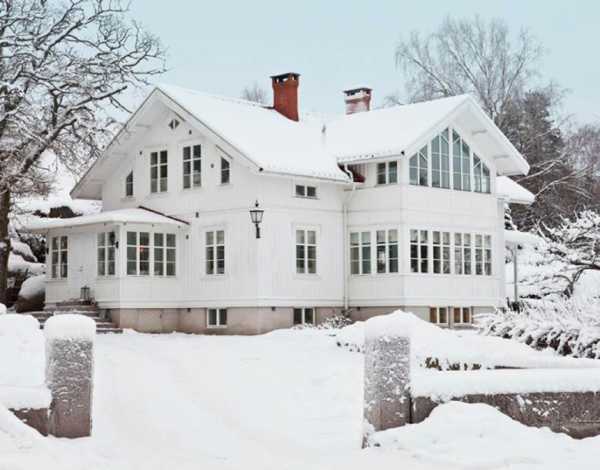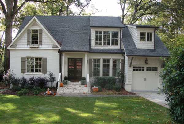 Чистый или состаренный белый цвет визуально увеличивает размеры дома, делая его фасад более ярким. Декоративные элементы будут лишними — лаконичный дизайн хорош сам по себе.