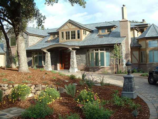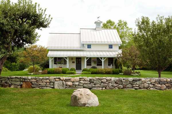 Во-первых, предпочтение лучше отдавать натуральным материалам, а в дизайне следовать стилям, близким к кантри. Хорошо будет смотреться фасад из натурального камня, деревянный сруб, неплохим вариантом станет кирпич.