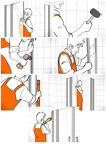 Душевой уголок может быть бескаркасным или с наличием рамы. В любом случае конструкция крепится к стенам с помощью фитингов, зажимного механизма и клипс. Если в качестве механизма открытия/закрытия дверей выбран раздвижной, устанавливается система роликов.