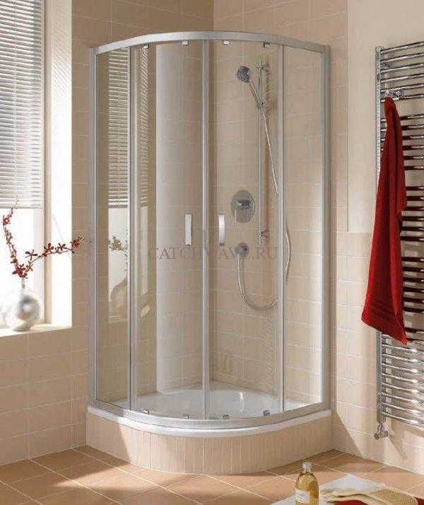 Сантехнические душевые изделия полукруглого типа устанавливаются в уголовной зоне ванной комнаты. Стандартная ширина дверцы в таких моделях варьирует в пределах 70-90 см, поэтому конструкция прекрасно подходит для монтажа в небольших помещениях.