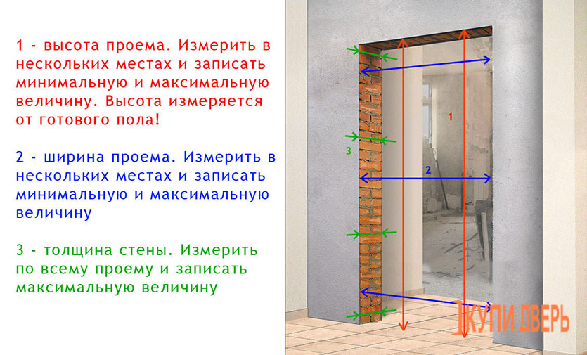 - Измерение глубины проема – толщина двери и стены, составляющей дверной проем.