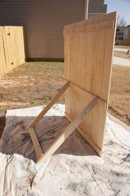 - Для каркаса выложите доски подходящего размера ровно и вплотную друг к другу на горизонтальную поверхность. Перпендикулярно к ним уложите 3 ребра жесткости вверху, посередине и внизу.