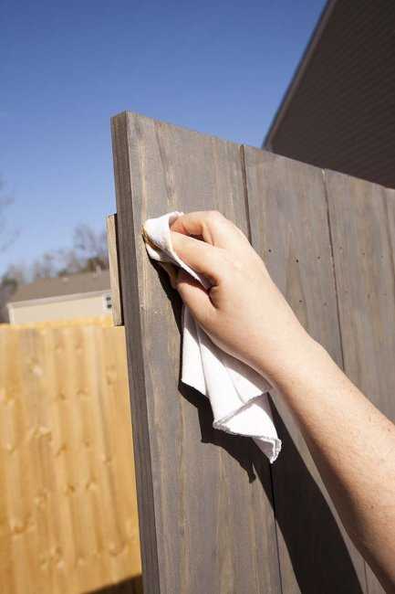 - Если древесина не обработанная, зачистите наждачной бумагой мелкой фракции и очистите от пыли. Затем нанесите пропитку кистью, или втирайте ее с помощью шерстяной ветоши (так текстура дерева будет выглядеть приятнее).
