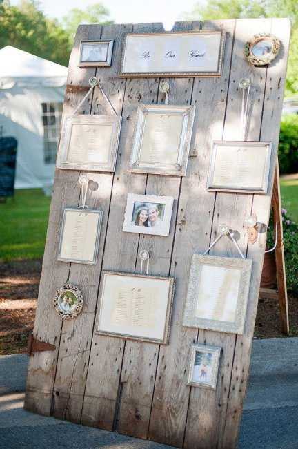 Кроме того, что такая стенка – отличный фон для свадебной фотосессии, используйте ее как схему размещения гостей. Прикрепите столько же рамочек, сколько будет столов. В центр каждой поместите табличку с номером стола, а вокруг стикеры или флажки на булавках с именами.