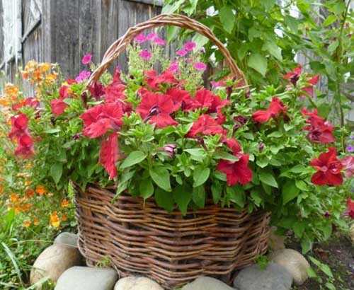 Пластиковые контейнеры с цветами выглядят лучше, если их немного приблизить к естественному виду, например, поместить в плетенную корзинку.