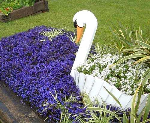 Необычный цветник-лебедь умело использует яркий контраст между белыми и синими кустами мелких цветов.