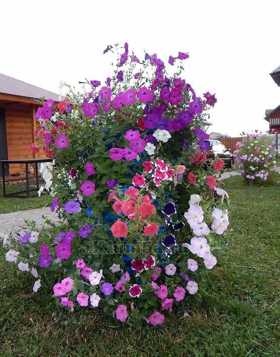 Возле самого дома у нас обычно отмостка около фундамента и тень — это не самое лучше место для большой клумбы. Но небольшой пенек от старого дерева и один куст ампельной петунии может сотворить маленькое чудо.