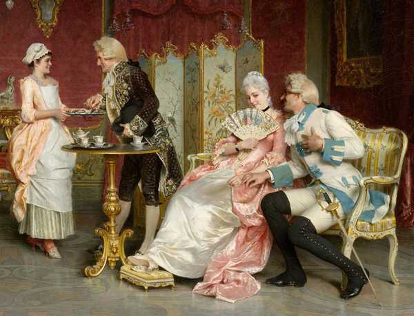 Фрагмент картины Артуро Риччи с изображением жанровой сценки в стиле рококо восемнадцатого столетия. На заднем плане ширма в стиле шинуазри
